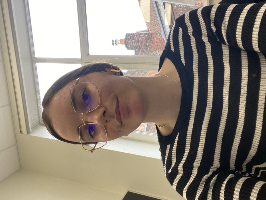 An image taken indoors depicts a young female looking directly at the camera, framed from the chest up. She has light skin, dark hair pulled back, and wears rectangular, rose-gold-toned glasses with a slight blue reflection in the lenses. Her expression is neutral, possibly with a subtle smile. She is wearing a long-sleeved top with horizontal black and white stripes, a thin silver chain necklace, and small, gold-colored, rectangular hoop earrings. Behind her, to the left, a light-colored wall and a portion of a dark-screened computer monitor are visible. The right side of the frame features a multi-pane window with a white frame and a horizontal blind at the top. Through the window, an overcast sky and the rooftops of several buildings are visible, typical of an urban environment. A prominent, reddish-brown brick chimney stands on a tiled roof in the middle distance. This chimney has a distinct cap featuring two smaller, upward-pointing conical elements. The architecture, characterized by red brick facades and tiled roofs, places the scene in the historic center of Lille, France, specifically in the area known as Vieux-Lille.
