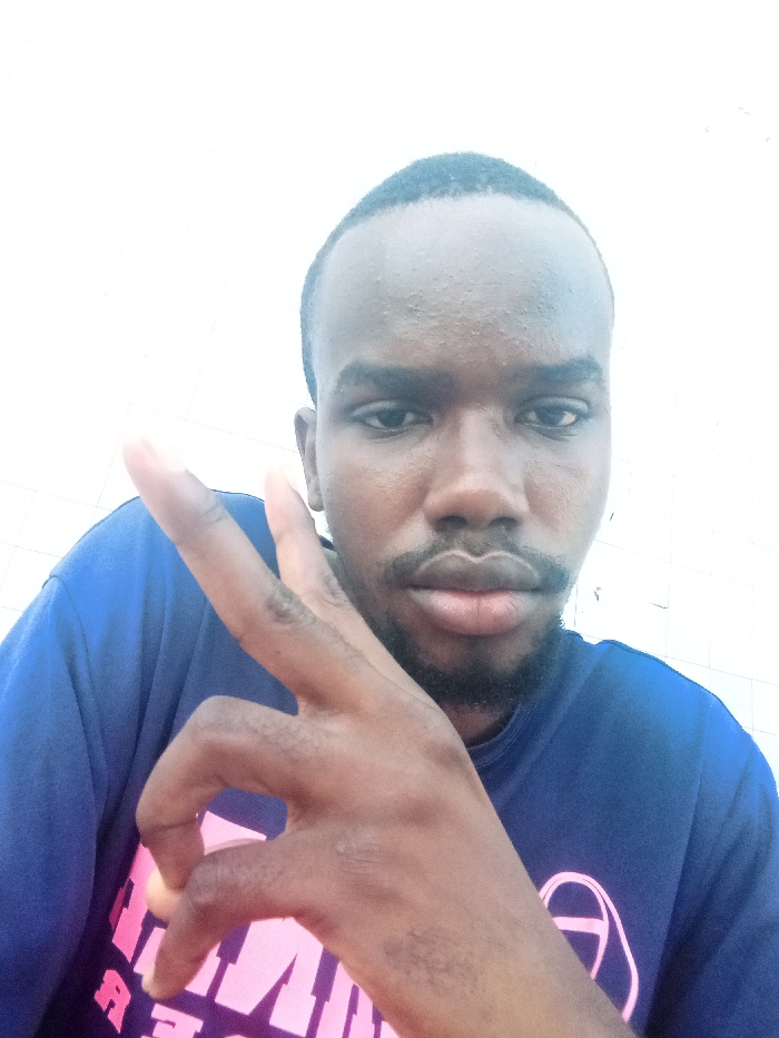 A close-up portrait captured in Mtopanga ward, Kenya, features a single male subject. The individual has dark skin, short dark hair, and a trimmed beard and mustache. He is wearing a blue short-sleeved t-shirt with a partially visible, faint pink/purple graphic design on the left side of his torso. The subject's left hand is raised, with the index and middle fingers extended upwards in a 'V' gesture, while the ring and pinky fingers are curled. His thumb is also visible, partially obscuring the lower left portion of his face. The subject is looking directly towards the camera. The background is uniformly bright white, appearing to be a plain wall, with subtle horizontal and vertical lines suggesting a tiled or textured surface faintly discernible in the upper and lower right portions of the frame.