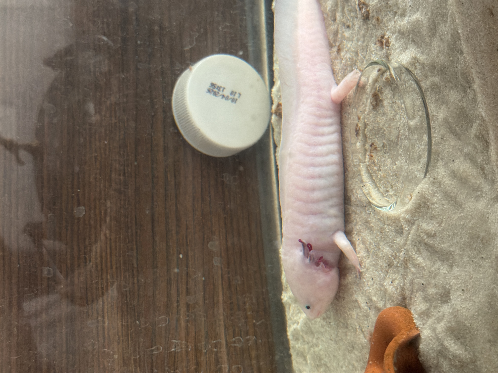 The image displays an indoor scene within an aquatic enclosure. A light pink, likely albino, axolotl is positioned horizontally on a light beige sandy substrate, facing towards the left. Its external, reddish-pink gills are prominent on either side of its head. Its left forelimb extends towards the lower left. The background behind the enclosure is a dark brown, horizontally-grained surface, possibly wood. The clear front panel of the enclosure exhibits multiple water droplets or marks. In the upper right quadrant, a white plastic bottle cap lies inverted, revealing printed text on its flat surface: "10/04/2026" and "L10 13:58". An irregular, curved, terracotta-colored object is partially embedded in the sand in the lower left. In the lower central area, a clear, thin, curved piece of glass or plastic, forming an incomplete ring, rests on the sand. No human subjects are visible, and no dynamic actions or interactions are depicted beyond the axolotl's static posture. The specific location within the city of Plovdiv, Bulgaria, or any other geographic location, cannot be determined from the visual information presented.