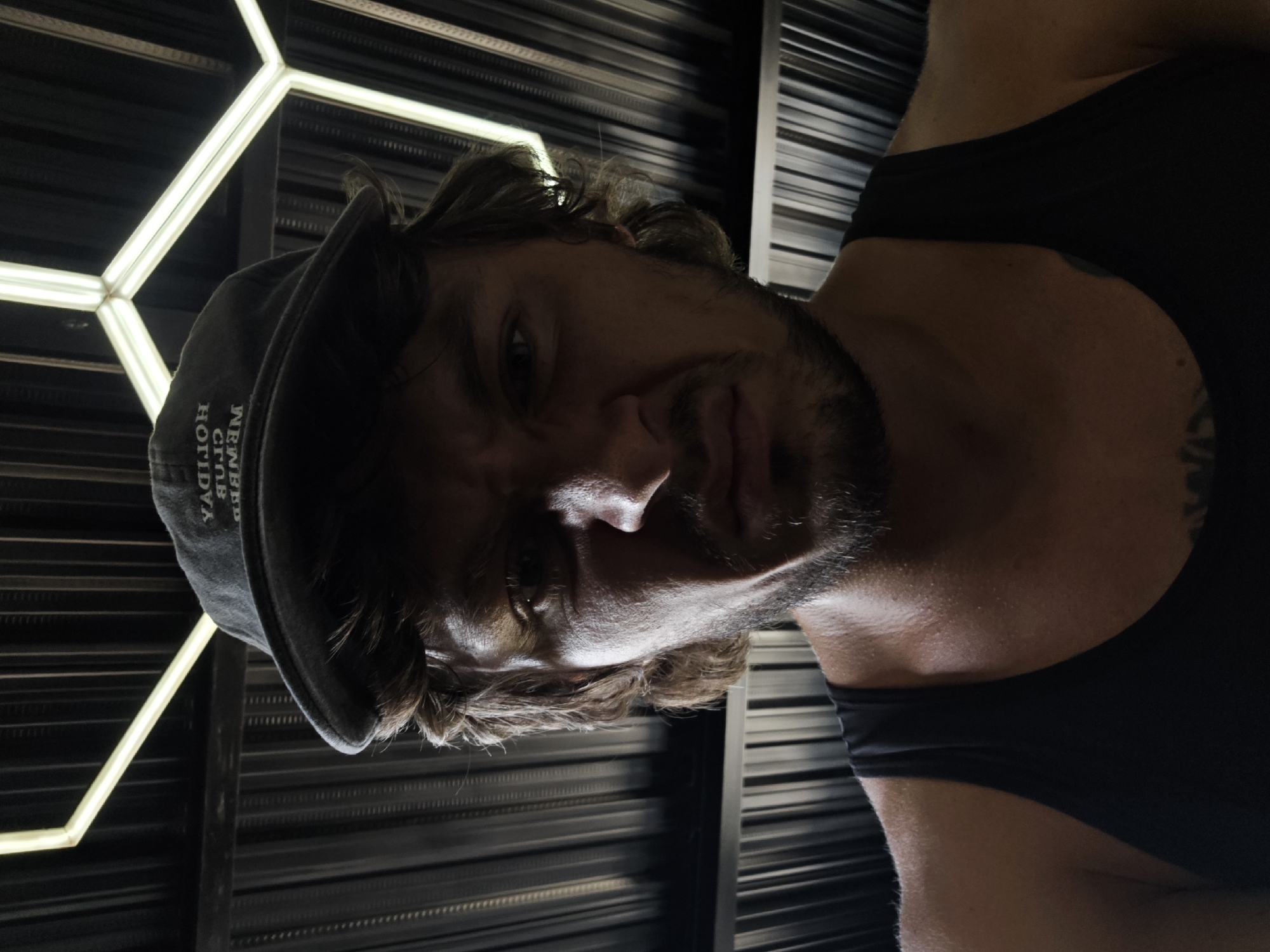 A man wearing a gray cap and a black tank top is oriented upside down in the frame. He has brown hair and a beard. The background features horizontal black slats, and a hexagonal light fixture. The text on the cap appears to be reversed, and partially obscured. The location is suggestive of an indoor space but has no evidence of Tibubeneng, Indonesia.