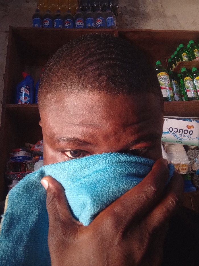 The image depicts a close-up of an individual partially obscured by a light blue cloth, positioned within a retail provisions store in Zango-ndaji, Nigeria
