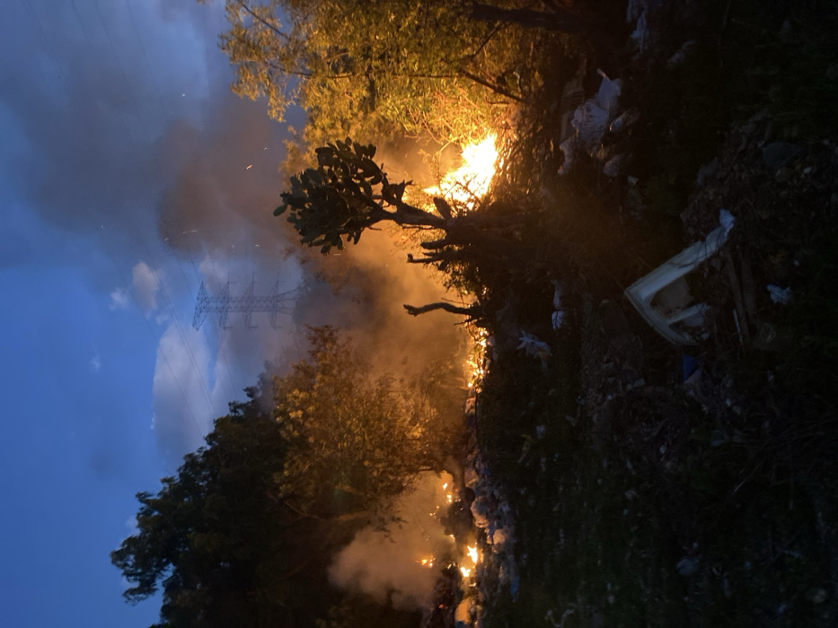 A landscape scene shows a fire burning intensely at night. The flames are consuming trash and brush, with smoke rising into the sky. In the background, an electrical tower is visible against the dusk sky with clouds. The firelight illuminates a tree, creating a stark silhouette. The scene appears to be near a landfill or an area where waste has accumulated.