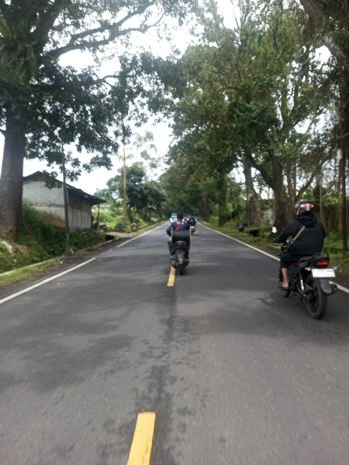 The image displays a paved two-lane road in Ariyalai East, Sri Lanka, viewed from a low perspective looking straight ahead. The asphalt road surface appears damp in areas and features a dashed yellow center line, bordered by solid white lines at its edges. Lush green vegetation, including grass and undergrowth, lines both sides of the road, with a visible drainage ditch or culvert running parallel on the left. Large, mature trees with dense green canopies densely line both sides, creating an overarching arboreal tunnel with dappled light filtering through. On the immediate left, a simple single-story structure with a light-colored facade and a dark, possibly corrugated, roof is partially visible amidst the foliage. Multiple motorcycles are traveling away from the viewer down the road. In the foreground, a person wearing a dark jacket and a helmet with a white and red pattern is riding a dark-colored motorcycle. Their feet, wearing sandals, are visible, along with a brown strap across their shoulder. Further ahead, another individual in a blue shirt is riding a dark scooter-style motorcycle, with a black object mounted on the rear. At least two additional motorcycles are visible further in the distance, following the others.