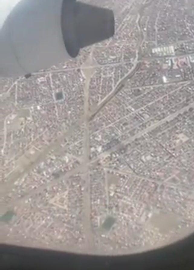 An airplane window provides a high-angle view of a sprawling city. The city appears densely populated with numerous buildings and a network of roads. Part of an airplane engine is visible outside the window.