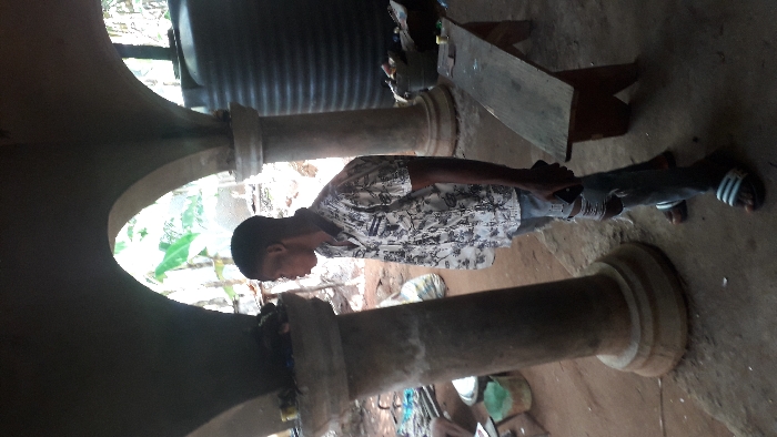 This image captures a young male individual standing within a semi-open, covered structure in Agukwu Nri, Nigeria