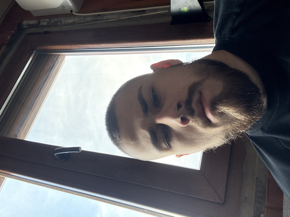 A male individual is depicted in a close-up, headshot-style photograph, positioned indoors within the city of Unknown, Unknown. He directly faces the camera with a neutral expression. The subject has a short buzz cut, dark eyebrows, and a well-groomed dark brown beard with a more prominent chin portion and defined sideburns. He wears a dark-colored, crew-neck t-shirt. The background consists primarily of a window and interior wall elements. To the left, a dark brown window frame is visible, extending diagonally from the top left towards the bottom center. A black, L-shaped window handle is positioned on this frame. Through the window, a bright, partially cloudy blue sky is visible, indicating daylight. To the upper right, a portion of a white, rectangular electronic device, possibly a wall-mounted appliance, is present with a white electrical cable extending downwards. Below this device, a dark brown wall or paneling with a subtle texture, possibly brick-like, is visible, along with a black, rectangular wall-mounted bracket or fixture.