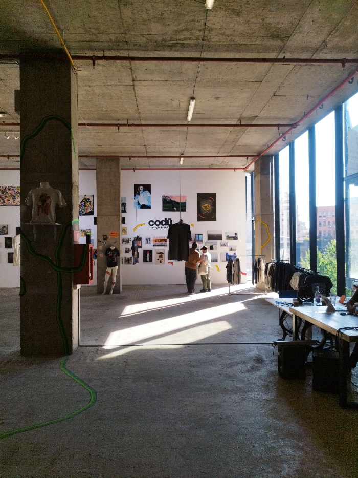An interior space with a concrete floor, pillars, and ceiling. Garments hang from a rack near a window letting in bright sunlight. Two individuals stand by a clothing item hanging from the ceiling. A display of posters and artwork covers a wall. A green line runs along the floor and up the pillar. A long table with objects sits in the foreground.