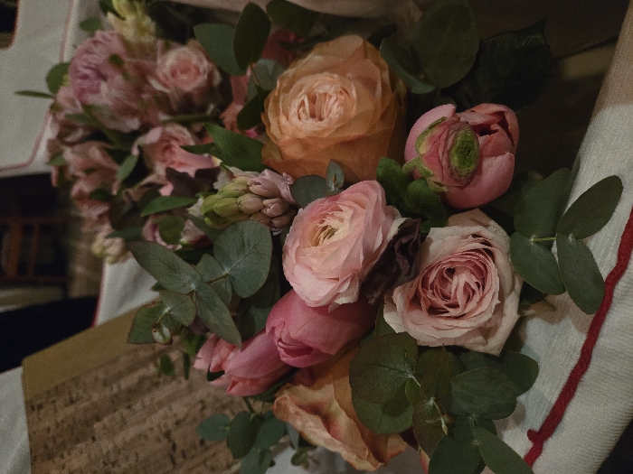 An indoor, close-up photograph displays a fresh floral bouquet positioned on a white textile surface with a prominent red stitched line. The bouquet predominantly features various pink and light orange ranunculus flowers, pink tulips in different stages of bloom, and interspersed green eucalyptus leaves. A developing light pink hyacinth bud is also visible within the arrangement. To the left of the bouquet, a portion of a textured, light brown object, consistent with a wooden surface or a book, is partially in view. The background is softly blurred, showing additional pink and lighter-colored flowers and indistinct interior elements, including what appears to be part of a wooden chair. No individuals, explicit actions, or direct interactions are depicted in the scene. The location is Sofia, Bulgaria.