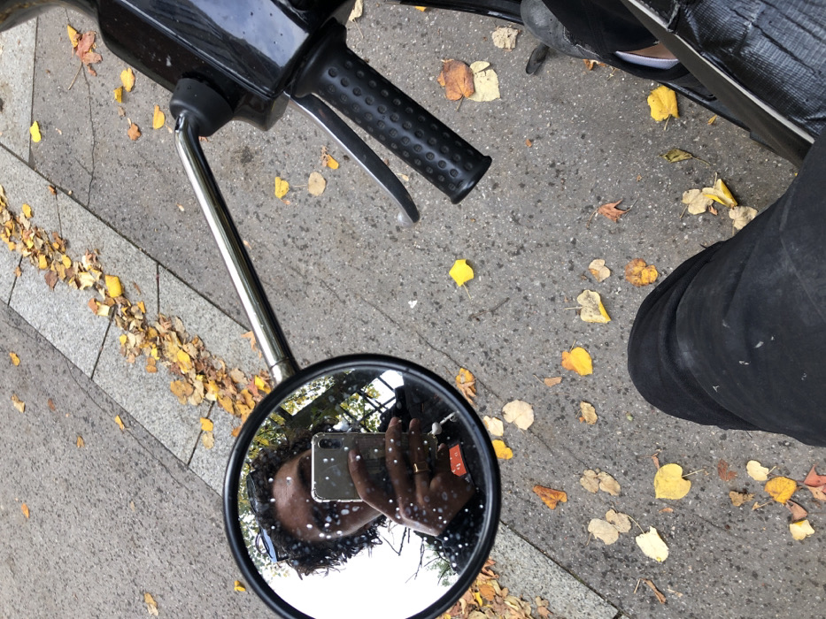 - "A top-down shot showcases the handlebar of a black scooter, its left mirror reflecting the photographer holding a phone" by FM-R1Zyf2, licensed under CC BY 4.0