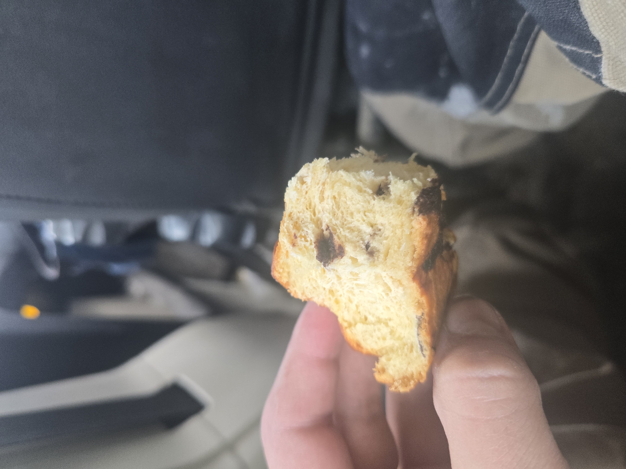 - "The image captures a close-up of a human hand holding a piece of light-colored baked good, likely bread or cake, interspersed with dark, irregular inclusions consistent with chocolate chips" by FM-IYQQn1, licensed under CC BY 4.0