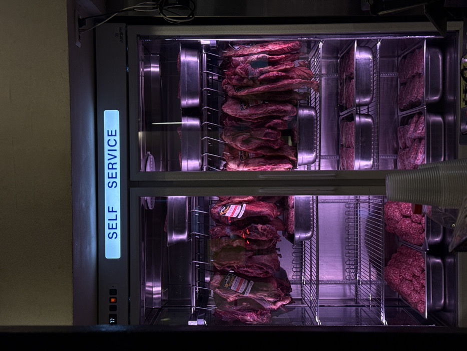A "self-service" refrigerated display case holds various meats. On the left are stacks of individually packaged steaks, some bearing labels. To the right, ground beef is neatly arranged in containers. Metal shelves and racks separate the sections. The lighting is a mix of cool and purple tones, enhancing the raw appearance of the meat. A stack of plastic cups partially obscures the right side of the image.