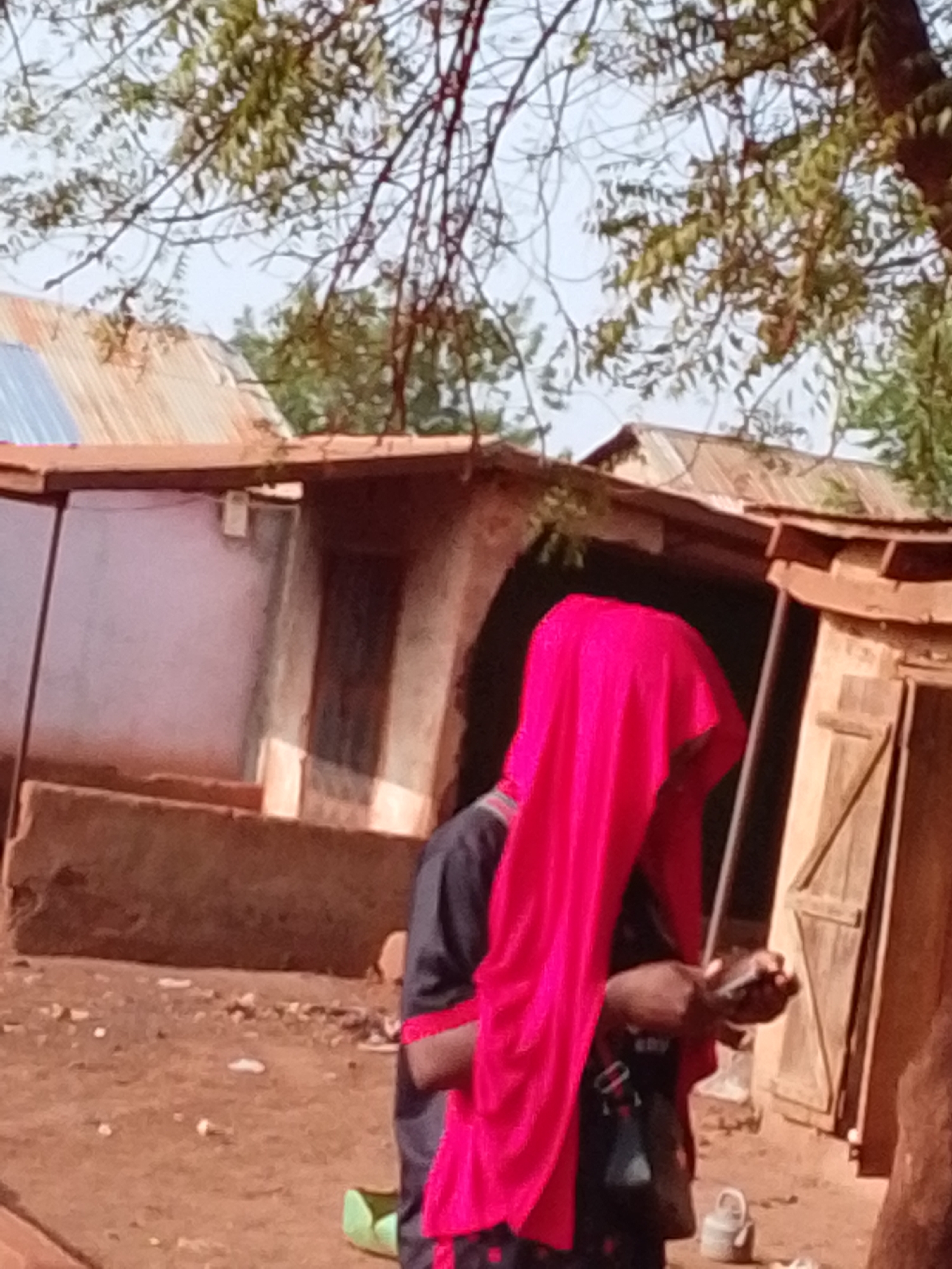 A person wearing a bright pink head covering and a black top stands in a rural setting, possibly in Tamale, Ghana