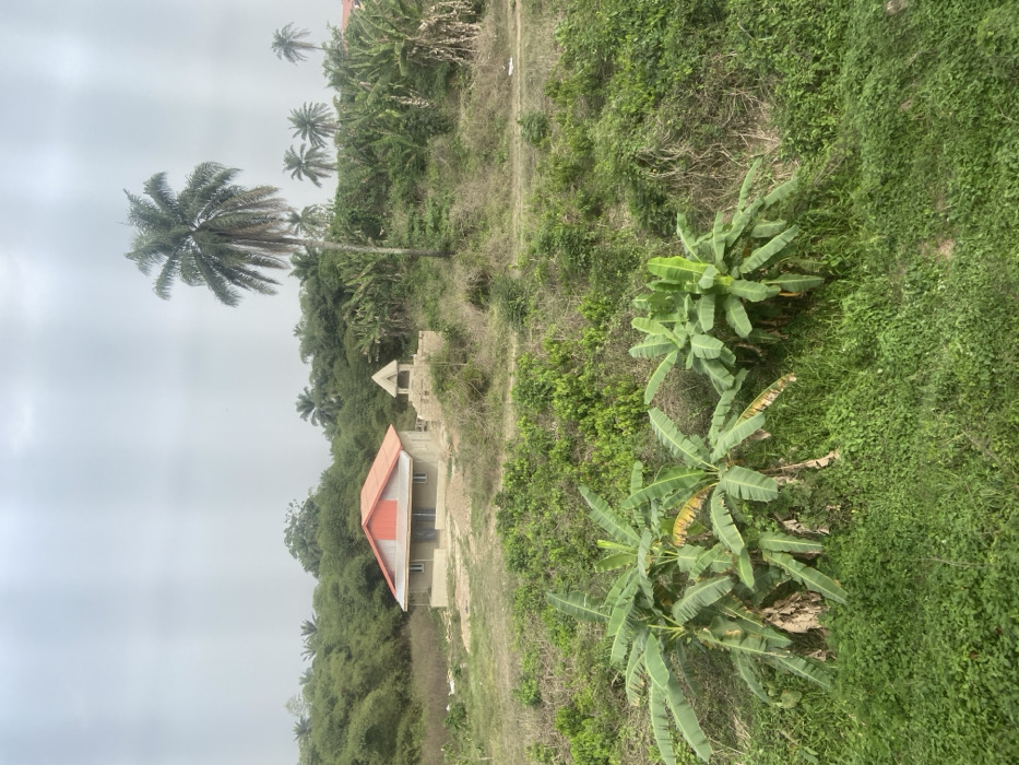 The image displays a rural landscape in Ipetumodu, Nigeria, under an overcast sky