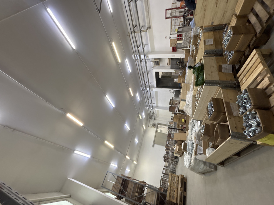 The image presents an interior view of an industrial warehouse or production facility situated in Sevlievo, Bulgaria. The expansive space features a light gray concrete floor and white painted walls and ceiling. The ceiling is equipped with multiple parallel rows of linear fluorescent light fixtures, emitting a mix of cool white and warm white illumination. In the foreground and midground, numerous wooden pallets are stacked with wooden crates and cardboard boxes. These containers are filled with small, uniform, metallic manufactured components, such as industrial fittings or bearings. Several items are also wrapped in clear plastic sheeting, positioned on pallets. A green plastic bag rests on top of one crate in the central foreground. To the left, a tall, multi-tiered metal shelving unit is visible, primarily stocked with wooden pallets. In the background, a large doorway with a partially opened sliding or roll-up door is present. Further to the right, another wide, open entrance or bay is observable. Along the upper right wall, multiple runs of metal piping and electrical conduits are mounted, supported by brackets. A partially visible individual, wearing a dark shirt, is located on the far right side of the image, with their back to the camera, appearing to be interacting with equipment or materials in that section of the facility. Various other industrial items, including what appear to be hand pallet trucks and red-framed carts, are dispersed throughout the background and right periphery of the scene.