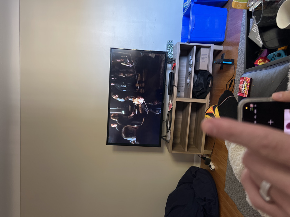 This image depicts an interior residential space, identified as being in Kingston, Canada. The scene is viewed from a low angle, likely from a seated position, looking towards a wall-mounted television and its associated console. In the immediate foreground, a human hand, specifically the left hand with a silver-colored ring on the ring finger, extends from the left towards the center. This hand holds a smartphone in a clear protective case, with its screen displaying a camera or photo application interface. To the right of the smartphone, a red and yellow Häagen-Dazs branded candy wrapper rests on a dark, possibly leather, surface. A white, textured rug or throw blanket is partially visible beneath the hand. The central feature of the image is a large flat-screen television positioned on a light-colored wooden media console. The television screen displays a scene from the show "Game of Thrones," specifically a trial scene featuring multiple characters in period attire. Prominent within the TV screen is a male character with reddish hair (Tyrion Lannister) seated in the foreground of the displayed scene, facing away from the room's viewer, with other figures standing around. The wooden media console beneath the TV has open shelving. On its top surface, a black electronic device, a red playing card, and a red Nintendo Switch Joy-Con controller are visible. The shelves below contain various items, including cables, a black fabric bag, and a cardboard box. To the left of the media console, a dark blue beanbag chair rests on a light brown wooden floor. A white power strip with black cables plugged in is situated on the floor near the beanbag. A black and yellow football (soccer ball) is partially visible on the wooden floor between the beanbag and the console. To the far right of the media console, two bright blue plastic recycling bins are stacked. The room's walls are painted a uniform light beige or off-white, and a white baseboard lines the bottom of the walls. The overall lighting suggests an indoor setting with ambient illumination.