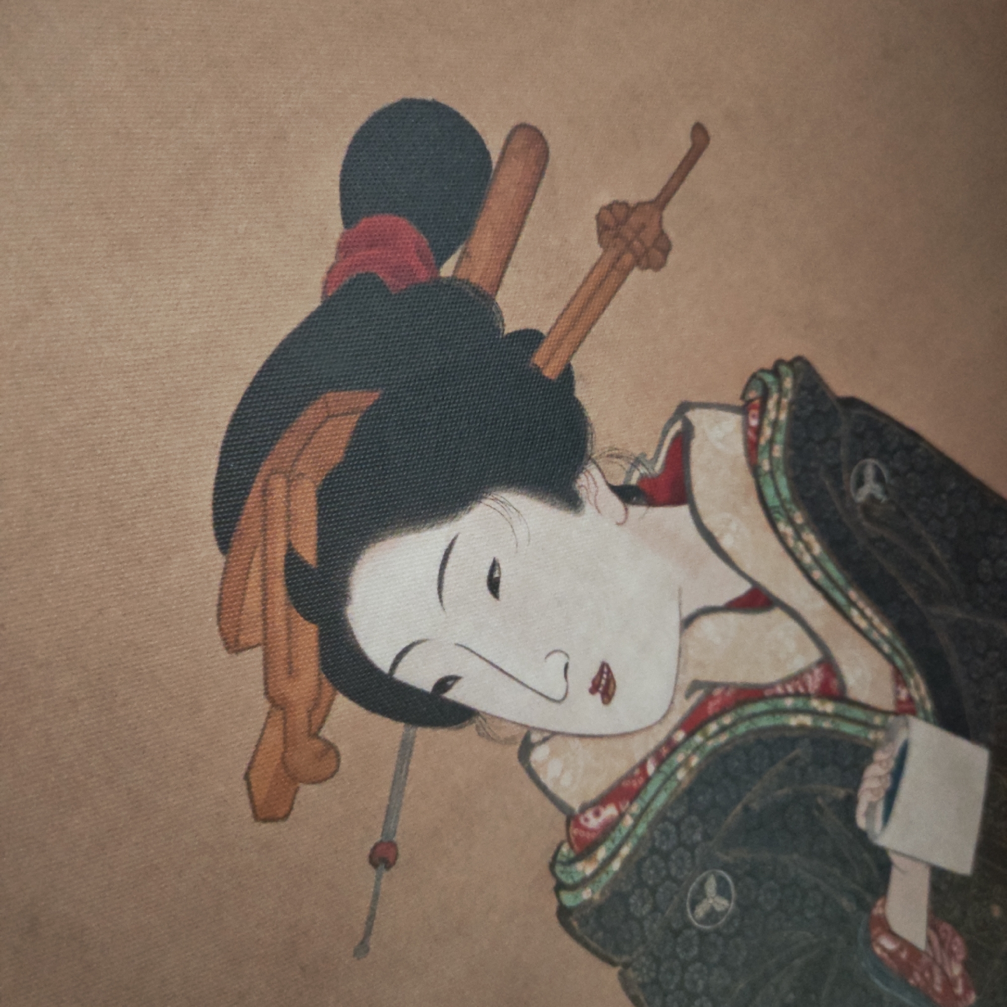 The image displays a traditional Japanese Ukiyo-e style artwork, depicting a female figure from the chest up, oriented diagonally on a textured, light brown background
