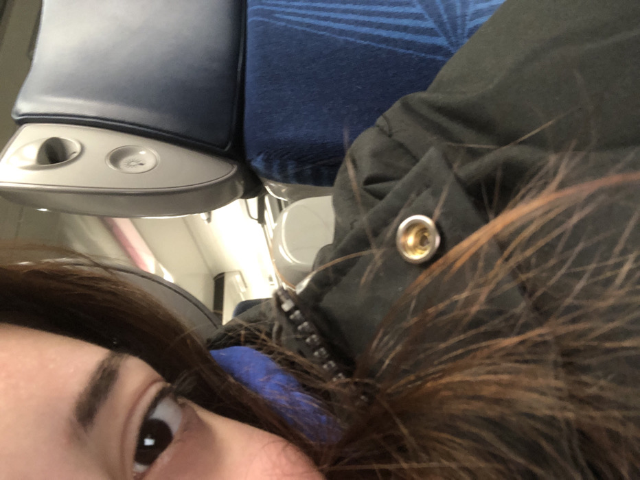An angled, close-up view shows a person on what appears to be a train. The seat's armrest, a glossy grey with indentations, is visible. The seat itself is blue. The person wears a dark jacket with a prominent metallic snap and has brown hair. Only one eye and part of an eyebrow of the individual are in focus. The inside of the train can be seen in the background.