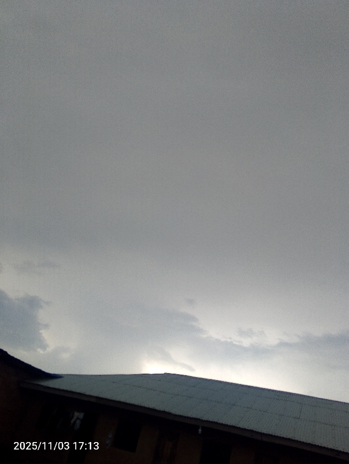 An outdoor scene captured at an upward angle reveals an overcast sky above the upper section of a building. The sky, occupying approximately two-thirds of the frame, displays a uniform grey cloud cover with varying densities, including a brighter, diffused light source near the horizon toward the right. The lower third of the image shows the roof and upper facade of a structure. The roof is constructed of corrugated metal, sloping gently downwards from the left. Below the roofline, a dark-toned wall section is visible, featuring multiple rectangular apertures, likely windows or doorways, and two discernible suspended light fixtures beneath the eaves. No individuals or active elements are present. A digital timestamp "2025/11/03 17:13" is imprinted in the lower-left corner. The scene is located in the city of Unknown, Unknown.