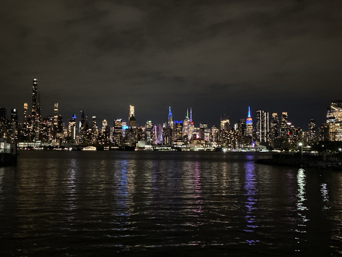 The image presents a panoramic nighttime view of the New York City skyline, observed from the waterfront in Weehawken, New Jersey, looking east across the Hudson River