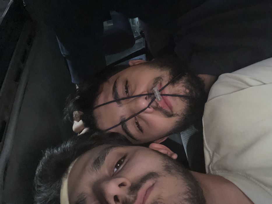 The scene is located in Sarouja Municipality, Syria. The image depicts two adult males in a close-up, selfie-style photograph within a dimly lit, confined indoor environment, consistent with a vehicle interior. The male on the left, in the foreground, has dark hair, a full beard, and a mustache, wearing a light-colored t-shirt. His lips are slightly pursed. The male on the right, positioned behind and to the right of the first, also has dark hair, a beard, and a mustache, and is wearing a dark-colored garment. A black elastic cord with a clear or white plastic adjuster is stretched across his lower face, positioned over his mouth and upper lip. One of his hands is visible near the top of his head, appearing to manipulate the cord. Both individuals are looking directly at the camera. The background is dark and indistinct.