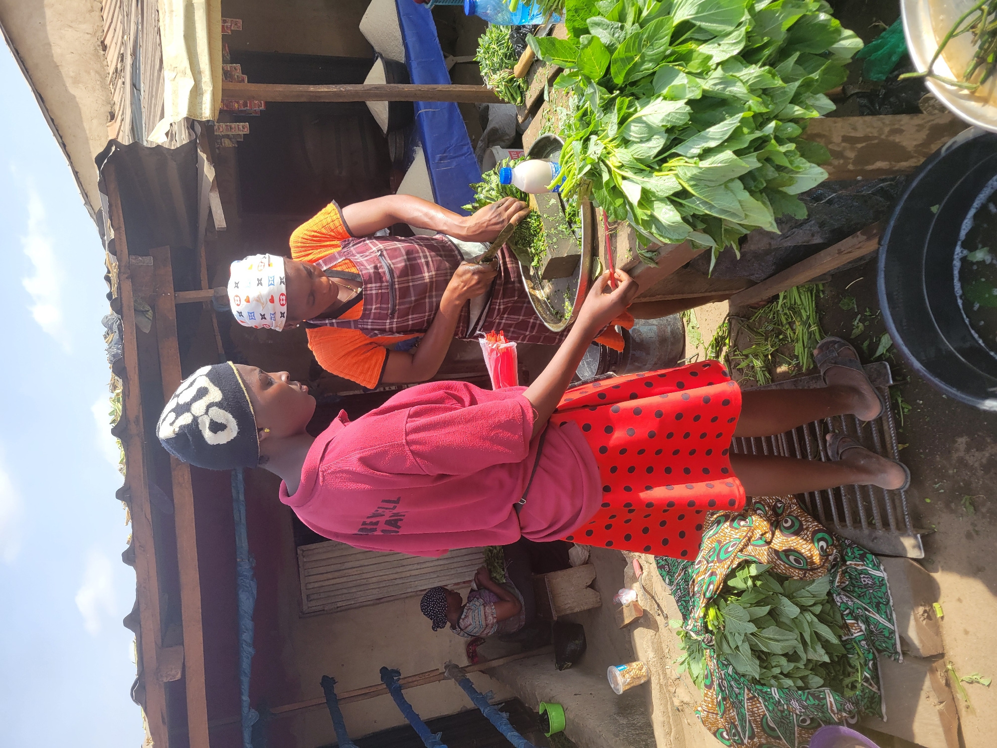 Two women are preparing vegetables at an outdoor market in Madalla, Nigeria