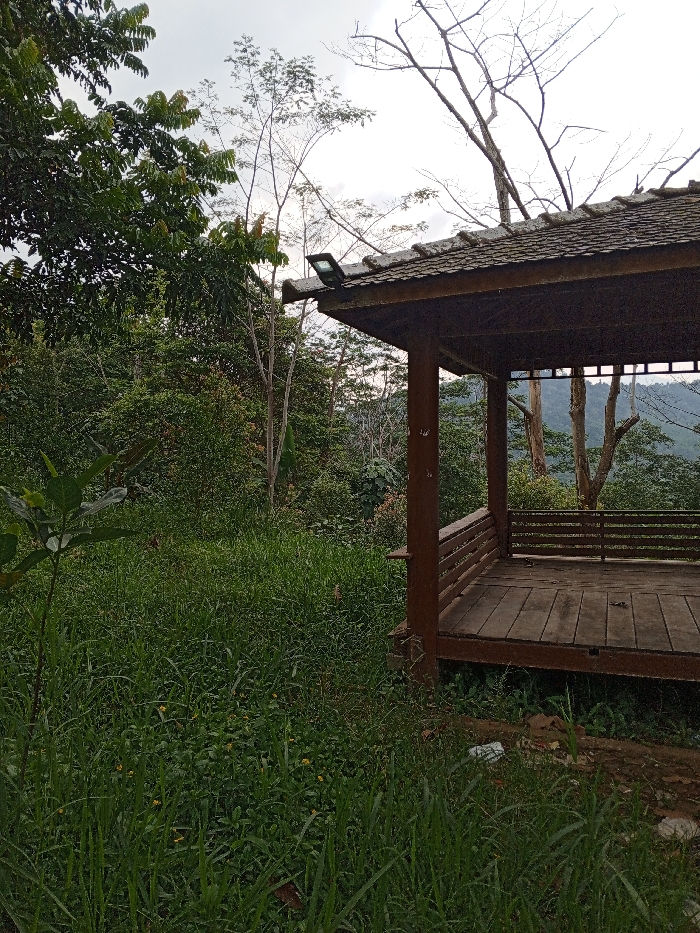 The image displays an elevated, open-sided wooden gazebo positioned within a dense, verdant, hilly landscape in Thotagamuwa, Sri Lanka. The gazebo features a brown tiled roof with an overhang, under which a black rectangular LED floodlight is mounted near the front right corner. Dark brown wooden posts support the structure, which has a weathered wooden plank floor and a low wooden railing or integrated bench along its visible interior perimeter. The foreground is characterized by dense, tall green grass interspersed with smaller plants and some yellow flowers; a young plant with broad green leaves is prominent on the far left. The midground and background consist of a thick forest of trees and shrubs, exhibiting both lush green foliage and several trees with bare, thin branches, particularly towards the distant background. Hilly terrain, also covered in vegetation, is visible beneath an overcast sky. No individuals or specific activities are present.