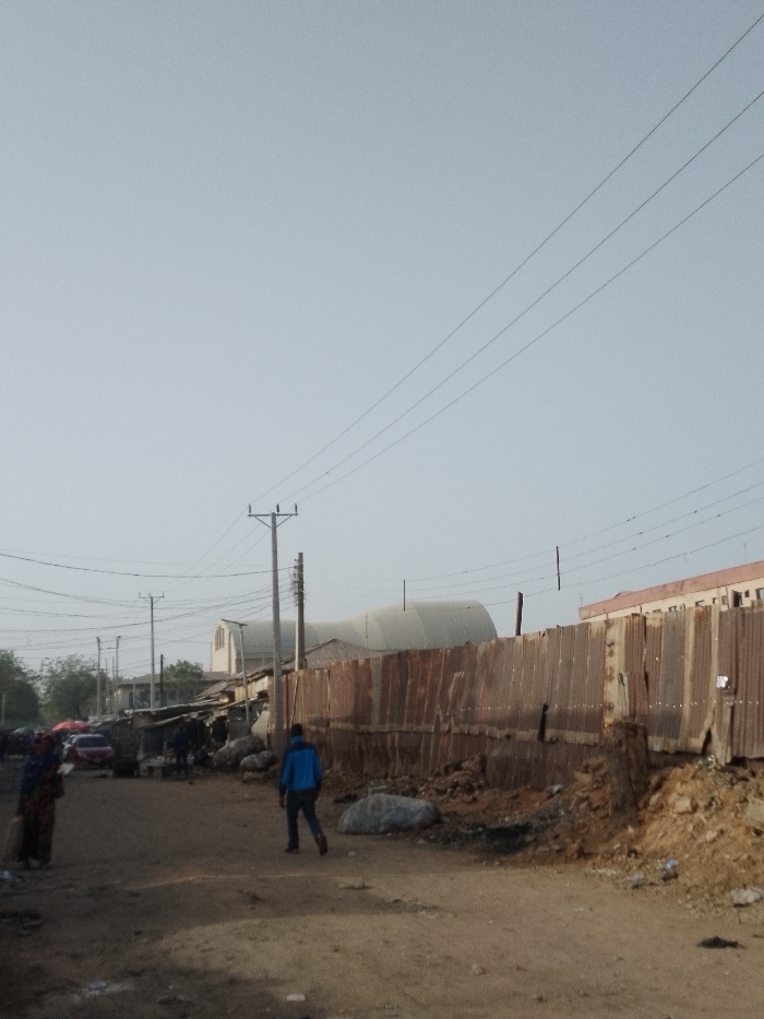 The image depicts an unpaved street scene in Sabon Gari West, Nigeria, under a hazy or overcast sky. Multiple utility poles and overhead power lines traverse the upper portion of the frame. The immediate ground consists of dusty, uneven dirt, scattered with rocks and debris. In the mid-ground on the right, a tall, weathered corrugated metal fence runs horizontally, with piles of earth and rubble accumulated at its base. Behind this fence, a light-colored multi-story building is partially visible on the far right. In the distant background, a large, light-toned building with a distinctive arched roof is prominent, flanked by other smaller structures and sparse trees. On the left side of the unpaved path, a series of rudimentary structures, possibly market stalls or small shops, are visible, featuring varied roofing materials such as sheet metal and tarpaulins. A red vehicle is partially obscured among these structures. Two primary individuals are depicted: one person, dressed in a blue long-sleeved top and dark trousers, walks away from the viewer towards the center of the path. Further down the path on the left, another person, wearing a patterned garment, walks towards the viewer, carrying an object in their hand. Several indistinct figures are also visible further down the path near the market structures.