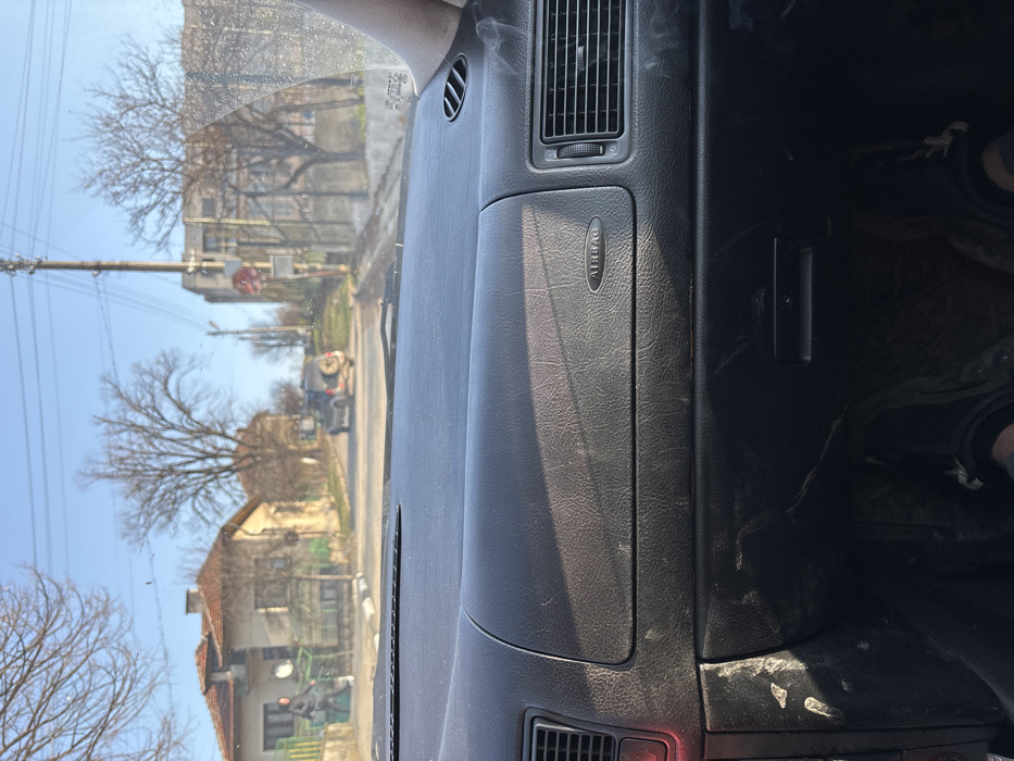 The image presents a daytime street scene in Cherven Bryag, Bulgaria, viewed from inside a vehicle. The foreground shows the black, textured dashboard of the vehicle, featuring an "AIRBAG" label on the passenger side and air vents on both sides. Sunlight casts shadows across the dashboard, and dust/dirt is visible on lower dashboard sections and the vehicle's floor, where a person's feet wearing dark footwear are visible. The windshield shows minor streaks/smudges. Beyond the windshield, an asphalt road curves slightly uphill. On the left side of the road, a light-colored house with a red tiled roof and a green fence is visible. A solitary individual, dressed in dark clothing, is standing or walking near this house. Further up the road, a dark-colored SUV or similar vehicle with a spare tire mounted on its rear is observed, either stationary or moving away from the viewer. On the right side of the road, a utility pole with overhead lines stands, and a circular red sign (possibly a stop sign) is affixed to another pole. Behind these, a multi-story building with a muted facade is partially visible. Numerous bare deciduous trees are scattered throughout the scene, indicating a colder season. The sky is clear and blue.