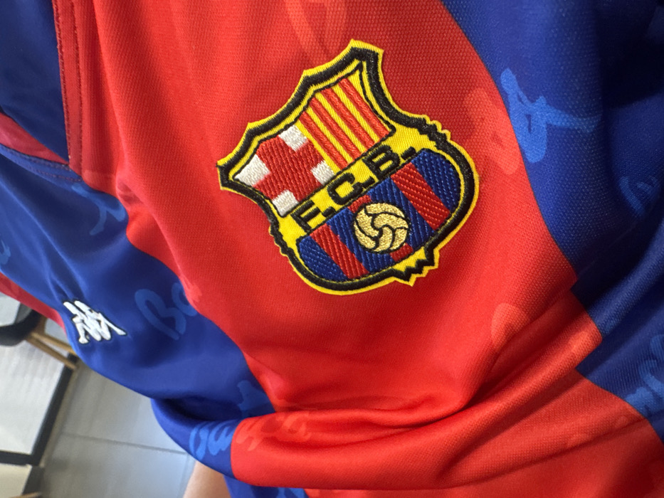 In Mirandela, Portugal, a close-up image depicts a person wearing a football jersey. The jersey is predominantly red and blue. On the red section, an embroidered FC Barcelona crest is prominently featured. The crest displays a multi-colored design with red and yellow vertical stripes, a red cross on a white background, and a golden football centered within a blue and red striped segment, accompanied by the letters "FCB." A white Kappa logo is visible on the blue fabric above the crest. Faint, darker blue 'Kappa' brand names are subtly patterned into the blue material. The jersey's fabric exhibits a textured, synthetic appearance. The background is blurred, indicating an indoor environment with indistinct elements.