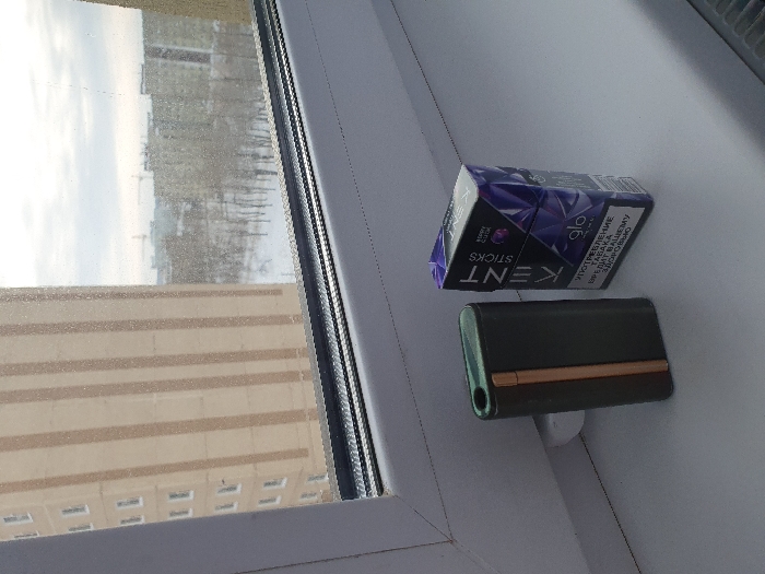 A pack of Kent tobacco sticks and a black Glo tobacco heating device rest on a white windowsill