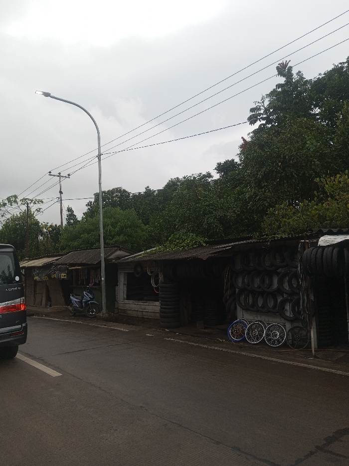 The image depicts a roadside scene in Sukanagalih, Indonesia, under an overcast sky. In the foreground and midground, an asphalt road features a solid white line on its left edge. The rear-left section of a dark-colored minivan is partially visible on the far left. On the right side of the road, a row of single-story commercial structures with corrugated metal roofs extends into the distance. The structure closest to the viewer is a tire shop, displaying numerous black tires stacked and hanging, along with several motorcycle wheel rims, including one blue-colored, leaning against its front facade. Adjacent to it on the left is another shop with visible merchandise inside its open front. A blue scooter is parked facing left on the roadside between these shops and a tall, grey streetlamp with an active LED light, positioned mid-left. Further to the left and rear, a wooden utility pole with multiple cross arms supports overhead power lines that traverse the upper portion of the frame. Dense green trees and foliage form a natural backdrop behind the structures. No individuals are present in the scene.