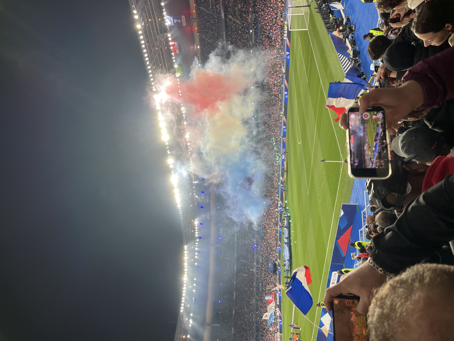 The image depicts a large crowd of people in a stadium. It appears to be a sporting event, possibly a football match. There are red, white, and blue smoke plumes rising from the field, which has green grass and is surrounded by a blue track. Many people in the stadium are holding up their phones to take photos or videos of the event. The view from the image is high in the stands. The coordinates provided, 48.924° N, 2.36° E, correspond to the Stade de France, a multi-purpose stadium located in the commune of Saint-Denis, just north of Paris.