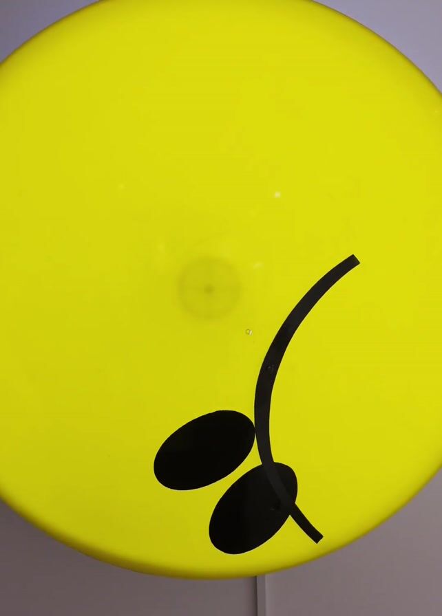 yellow disc with black markings that suggest a stylized face, possibly a smiley face with a cheeky or slightly mischievous expression. The disc is set against a neutral, possibly light grey, background. The lighting seems even, and the disc itself appears smooth. The video doesn't capture any actions or interactions, focusing solely on the static image of the disc. There are no visible people present in the frame.
