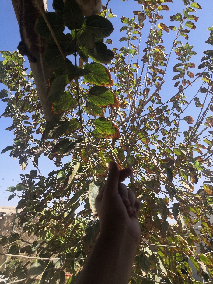 A low-angle view in Akhundzadakhail, Pakistan, captures a human right hand in the lower-center foreground, forming a 'finger heart' gesture. The hand is shadowed. The scene is dominated by a tree canopy under a clear blue sky. The tree branches are populated with leaves exhibiting varied coloration, from green to yellow and brown, with some leaves showing marginal desiccation. A dark, thick, horizontal structural element, possibly a beam or substantial branch, is positioned in the upper-left quadrant, from which additional foliage extends. Faint outlines of distant structures and utility wires are visible against the horizon in the left background. The lighting suggests full daylight.