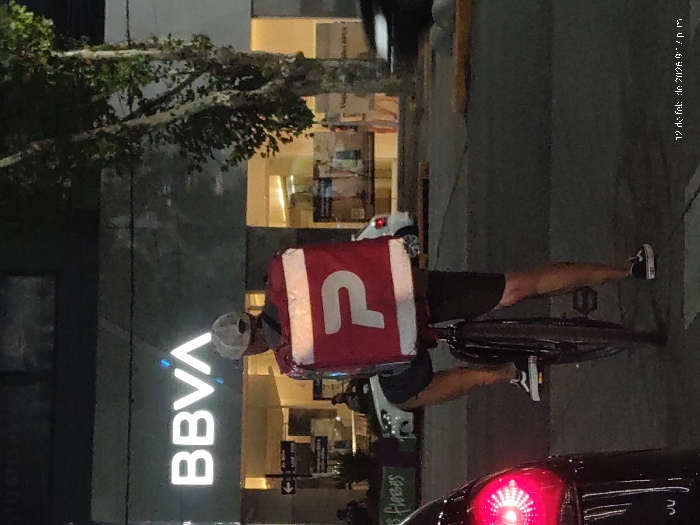 A person wearing a helmet rides a bicycle on a city street. The cyclist is carrying a red delivery bag with a large white "P" on it. A BBVA bank sign is visible in the background. A car with its taillights illuminated is in the foreground. The image is somewhat rotated and was taken at night, as indicated by the date stamp in the corner.