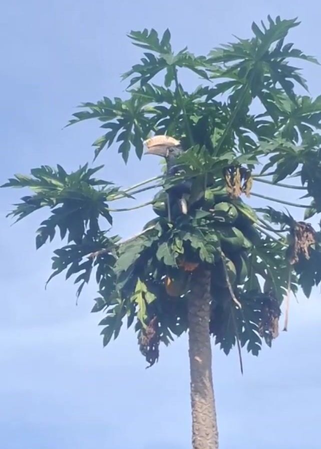 A bird, possibly a white-collared manakin, is visible among the leaves and papayas of a tall papaya tree against a clear blue sky