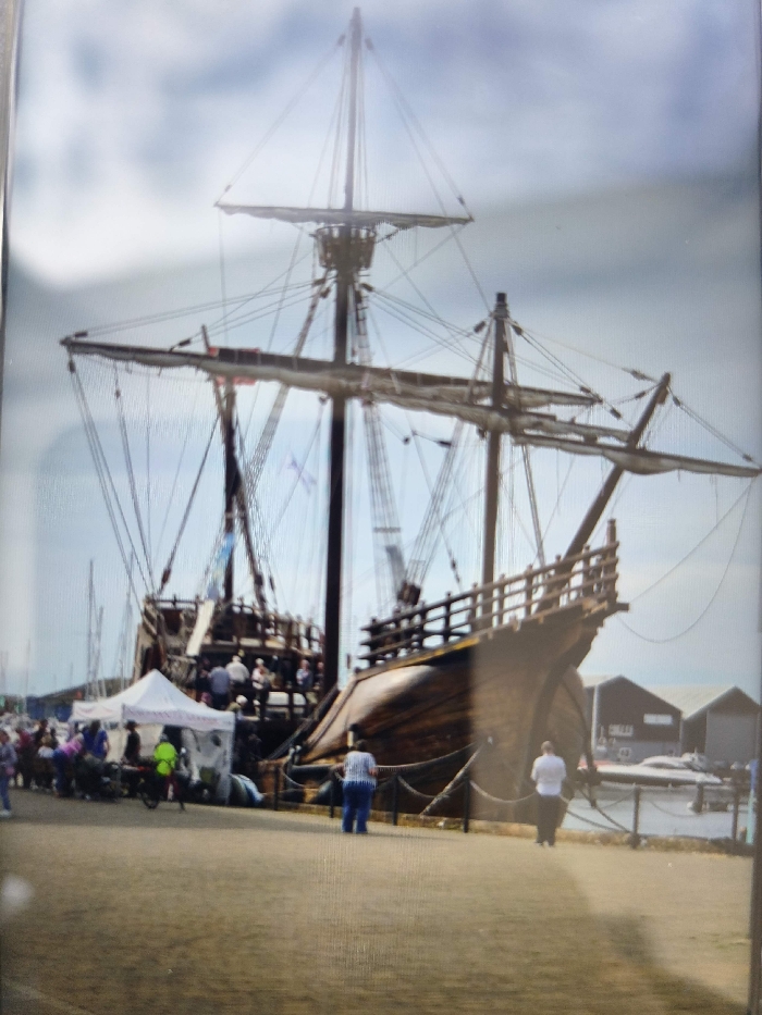 - "The image presents a scene at a waterfront in East Suffolk, United Kingdom, centered on a large, three-masted wooden sailing ship, characteristic of an historical carrack or galleon" by FM-Cm5AQ2, licensed under CC BY 4.0