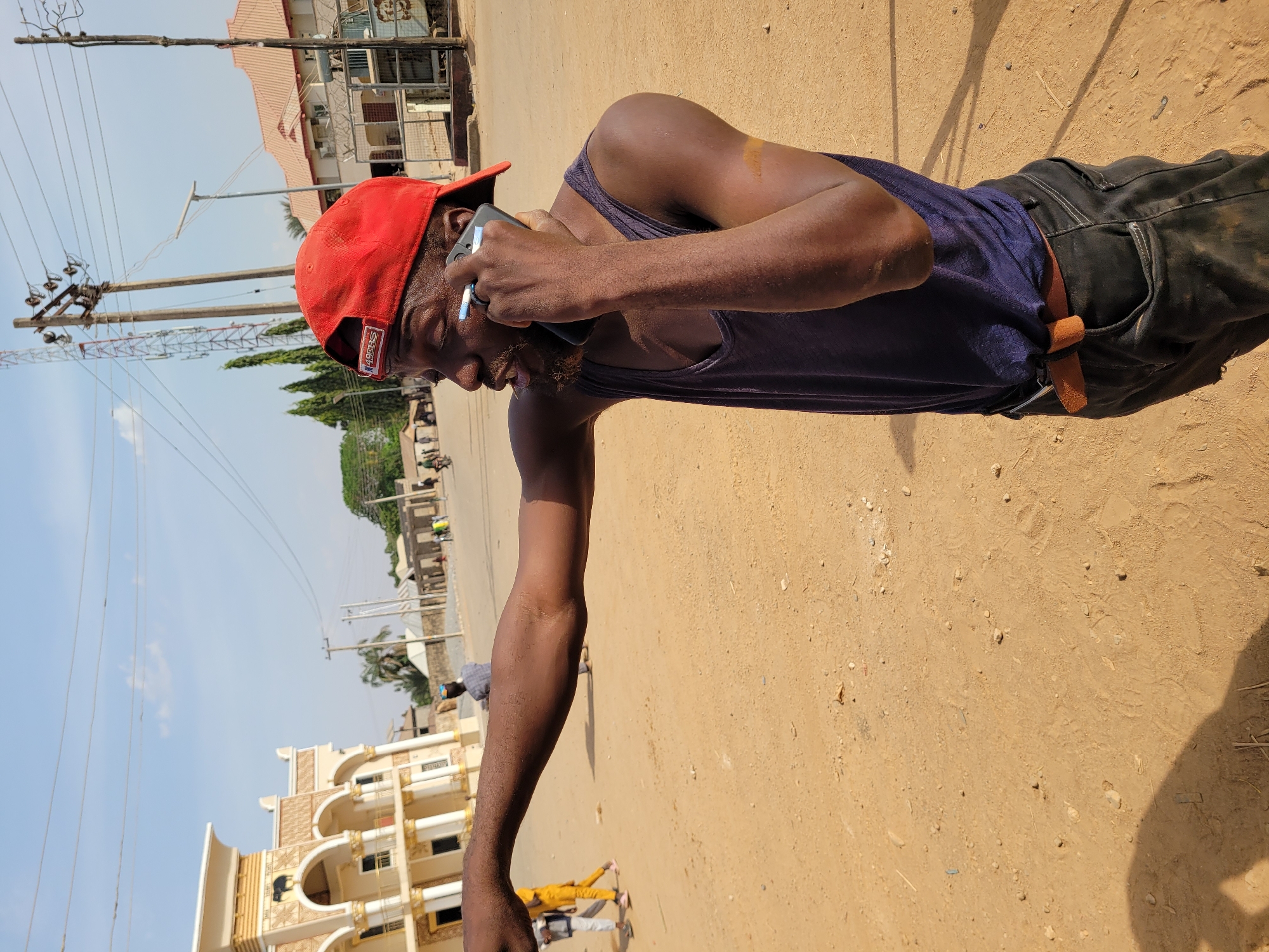 A dark-skinned male is centered in the image, wearing a red baseball cap with "49ERS" visible on the back, a dark blue sleeveless tank top, and dark trousers with a brown belt. He holds a dark-colored smartphone to his right ear, appearing to speak, with a small light-colored cylindrical object lodged between the phone and his ear. His left arm is extended straight out to the left, with the hand seemingly pointing. He stands on a light brown, sandy or dusty ground with scattered small rocks and debris. His shadow extends from the lower-left. In the background to the left, a prominent two-story building with beige walls, ornate golden trim, arched windows, and white columns is visible. An emblem, possibly an elephant head, is present above an arch on the upper floor. Further left, two individuals walk on the dirt ground, one dressed in a yellow garment. To the right, two utility poles with numerous overhead wires stand against a clear blue sky with minimal cloud cover. A metal lattice communication tower is visible in the far distance. Further right, a building with a reddish-brown tiled roof and light-colored walls is partially obscured by fencing topped with barbed wire. The general environment is an outdoor street or open area in Nassarawa Egon, Nigeria, characterized by dry, sandy earth, diverse architecture ranging from ornate to simpler structures, and visible utility infrastructure including power lines and a cell tower. Distant figures and what appears to be a motorcycle are visible further down the road.