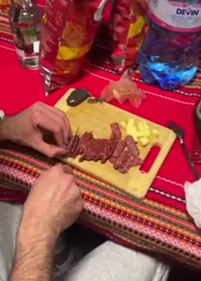 A man is sitting at a table with a red, intricately patterned tablecloth. In front of him is a wooden cutting board with sliced meat and cubed cheese. He is carefully slicing the meat with a knife. Around the cutting board are various items including bottles of liquor, bags of chips, and a large bottle of water. The man is wearing grey sweatpants. The scene suggests a casual gathering or snack preparation.