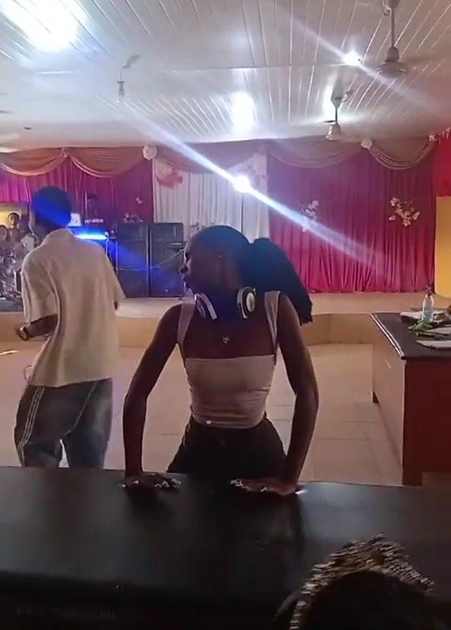 young woman dancing on what appears to be a table at a party or event. She is wearing a white top, black pants, and headphones around her neck. A man stands next to the table, watching and smiling. In the background, there is a stage with red and gold curtains, speakers, and other people. The room is brightly lit with fluorescent lights and ceiling fans.