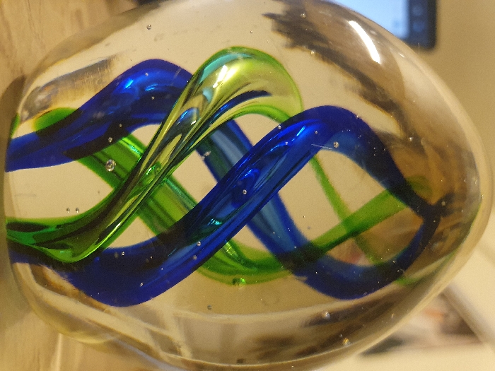 - "An egg-shaped clear glass paperweight is centrally positioned, containing intertwined reflective blue and green ribbon-like glass structures" by FM-LJRLv2, licensed under CC BY 4.0