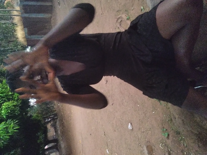 A woman in a dark, textured dress is crouching on a dirt surface. She has both hands raised in front of her face, fingers spread. The background is blurred, revealing hints of greenery and a structure. The image is grainy and appears to be taken outdoors.
