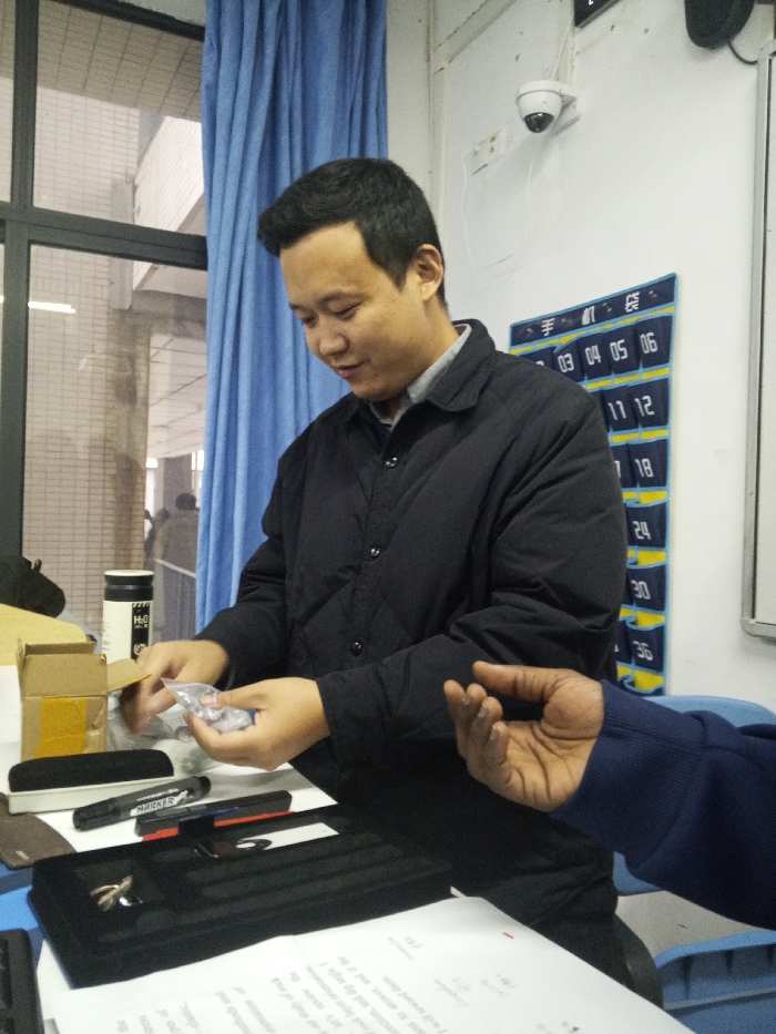 A man in a black jacket stands at a desk near a window and a blue curtain. He opens a small plastic bag containing tiny objects. On the desk are a cardboard box, pens, and documents. Another person’s hand reaches into the frame, offering to receive something. Behind the man is a wall with a security camera and a calendar-like chart displaying numbers.