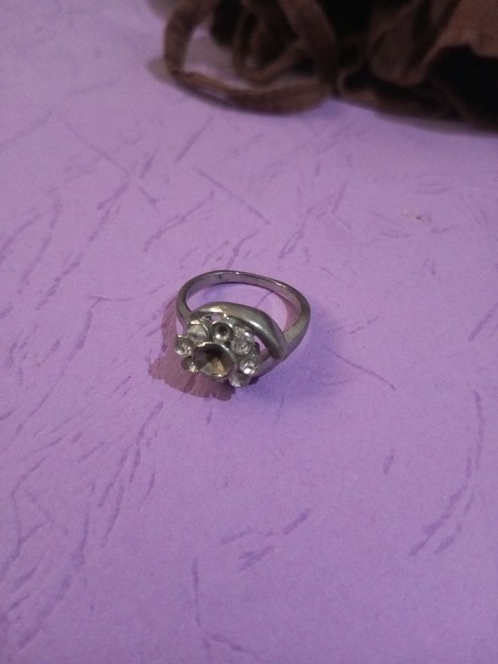 A silver-colored ring is positioned slightly off-center on a textured, light purple surface. The ring features a top cluster design: a central circular setting, which appears dark or empty, surrounded by seven smaller, clear, faceted stones arranged in a floral or circular pattern. The metal band exhibits a slightly dull, possibly worn, finish. A blurred, dark brown, amorphous object is visible in the upper background. No individuals, actions, or interactions are present. The scene is located in the city of Chandragiri, Nepal.