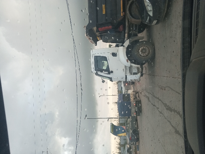 Rain splatters a window as a line of vehicles, including a white cab-over truck and a dark-colored dump truck, sit in traffic. The sky is overcast with heavy, gray clouds. Utility poles and power lines line the road. Other cars are visible in the distance. The view is from inside a car.
