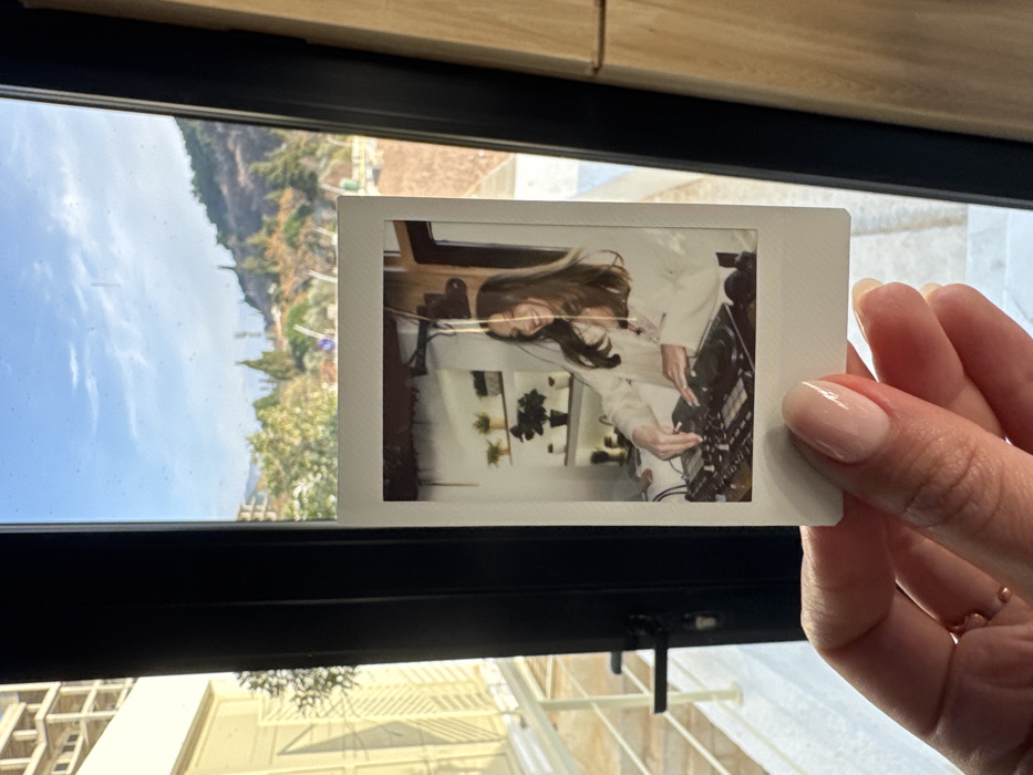A right hand with manicured, light pink fingernails, wearing a metallic ring on the ring finger, holds a white-framed instant photograph vertically in the center of the frame