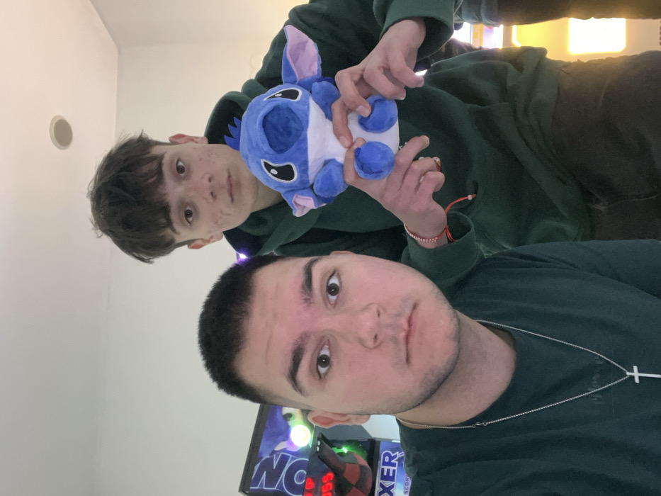 The image depicts two males inside what appears to be an indoor entertainment venue, likely an arcade, given the presence of an arcade game machine in the background. The exact location within the city of Pazardzhik, Bulgaria, cannot be determined from the visual evidence. The individual in the foreground is a male with short, dark hair and light skin, looking directly at the camera. He is wearing a dark green long-sleeve shirt and a silver chain with a prominent silver cross pendant. Behind him and slightly to the right, a second male is visible, also looking directly at the camera. He has shaggy dark hair, visible skin imperfections on his face, and is wearing a dark green hooded sweatshirt. His left wrist displays a red string bracelet. This individual is holding a blue plush toy, resembling the character Stitch, with both hands, presenting it towards the camera. In the left background, part of an illuminated arcade game machine or claw machine is visible, displaying glowing lights in green, red, and purple hues, and partial text including "BOXER" and "SCOR". The overhead ceiling appears white and features a recessed light fixture.