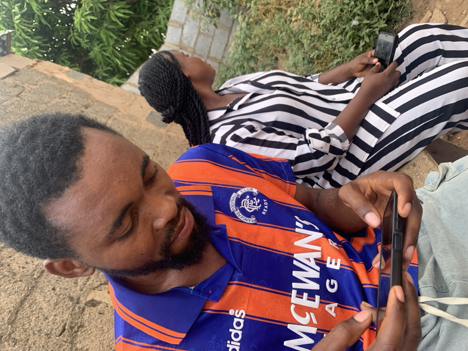Two individuals are seated outdoors in Bwari, Nigeria. The subject on the left, an adult male with dark hair and a beard, is dressed in a blue and orange vertically striped polo shirt featuring an Adidas logo on the right chest, a Rangers Football Club crest on the left chest, and "MCEWAN'S LAGER" text centrally. He is looking downwards, manipulating a black smartphone with both hands. The subject on the right, an adult female with dark braided hair pulled back, wears a black and white vertically striped long-sleeved shirt and matching pants. She is turned to her right, away from the camera, holding a black smartphone in her left hand, which rests on her lap. The background consists of a textured, light brown wall made of stone or unrendered blocks, partially visible behind the individuals. To the right, dense green foliage from a tree is present, and a lower wall constructed of grey concrete blocks is also discernible.