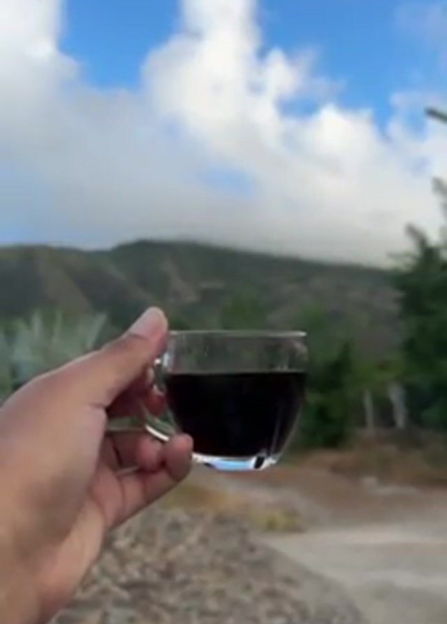 A close-up shot shows a hand holding a small glass cup filled with dark liquid, possibly coffee