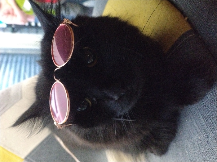 - "A black cat with long whiskers and green eyes wears pink-tinted sunglasses with a gold frame" by FM-M4lpO2, licensed under CC BY 4.0
